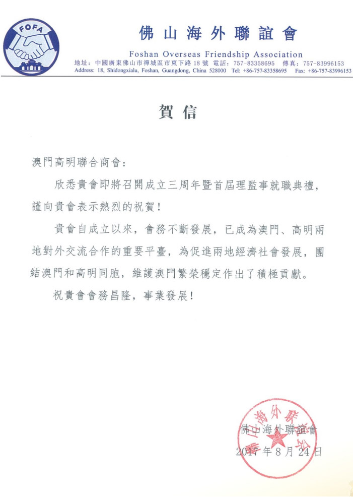 佛山海外聯誼會賀信