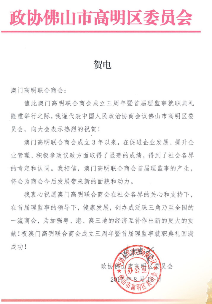 政協佛山市高明區委員會賀電